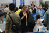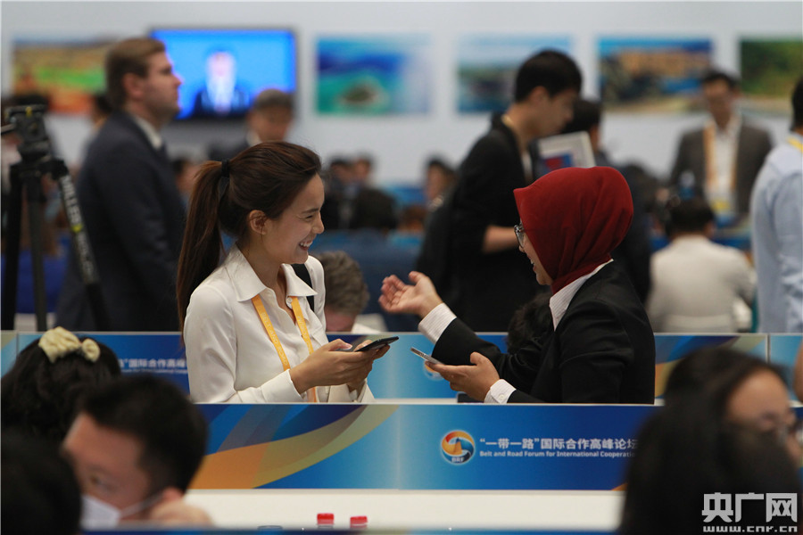 在“一帶一路”國(guó)際合作高峰論壇新聞中心內(nèi),兩名記者互留聯(lián)系方式。(央廣網(wǎng)記者 韓靖 攝) -