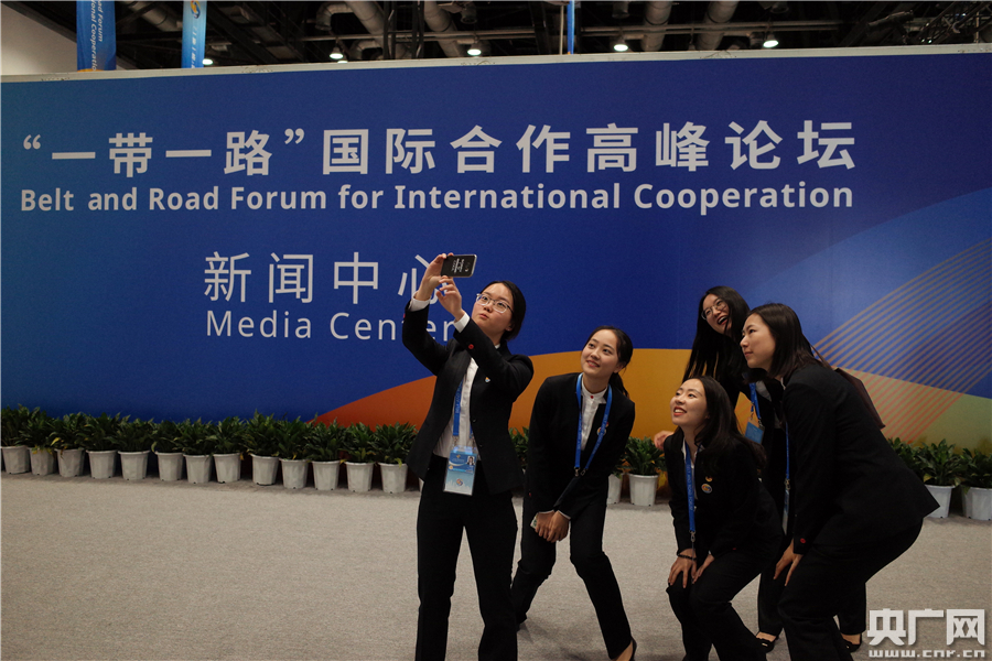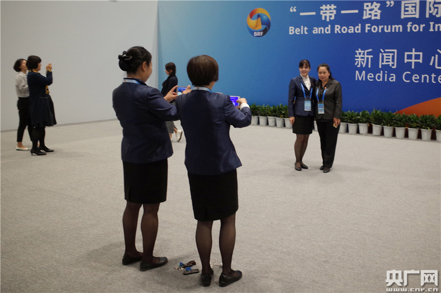 在“一帶一路”國(guó)際合作高峰論壇新聞中心內(nèi),工作人員們紛紛合影留念。(央廣網(wǎng)記者 王永康 攝) -