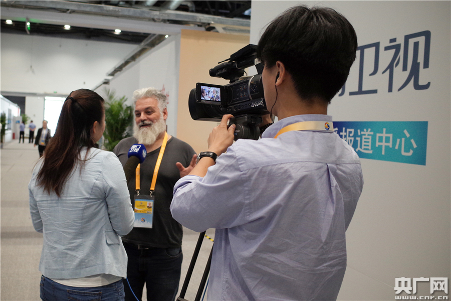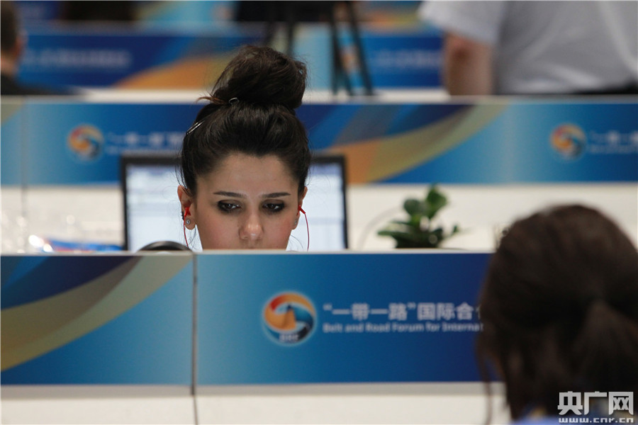在“一帶一路”國(guó)際合作高峰論壇新聞中心內(nèi),記者在進(jìn)行采訪。(央廣網(wǎng)記者 王永康 攝) -