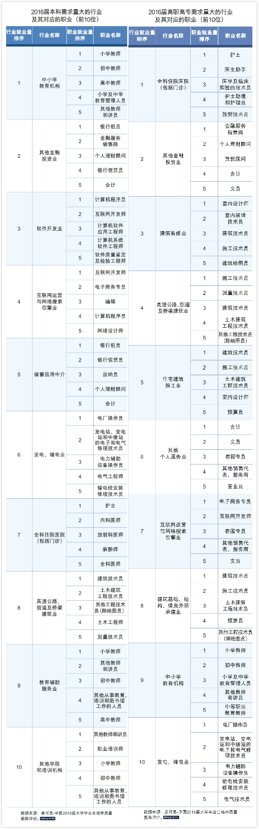 記者根據(jù)調(diào)查數(shù)據(jù)了解到,在對(duì)本科和高職高專畢業(yè)生需求量最大的前十個(gè)行業(yè)中,有六個(gè)行業(yè)是重合的,包括:“中小學(xué)教育機(jī)構(gòu)”“其他金融投資業(yè)”“互聯(lián)網(wǎng)運(yùn)營(yíng)與網(wǎng)絡(luò)搜索引擎業(yè)”“發(fā)電、輸電業(yè)”“全科住院醫(yī)院(包括門診)”“高速公路、街道及橋梁建筑業(yè)”?梢姼呗毟邔:捅究菩枨罅枯^大的行業(yè)存在一定的一致性。