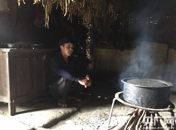順著山路走大約1個小時,門大爺家就建在顯眼的半山腰處。從他祖輩開始在此安家落戶,已經(jīng)過去了200多年。房子是地區(qū)典型的“千腳落地樓”:籬笆圍墻、木板為門、茅草做頂、千腳樹枝落地支撐,一層養(yǎng)了3頭豬和3只雞;二層是老兩口的“臥室”和“廚房”。