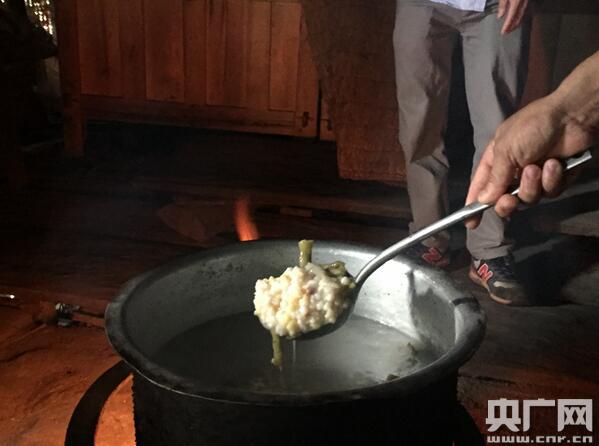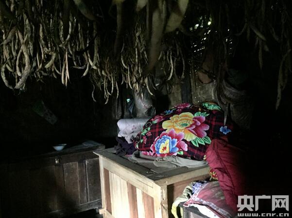 20平米左右的一間屋子,陰暗潮濕,站在屋內(nèi)都都看不清對面人臉模樣,中間用柴火支起的鍋里正煮著苞谷粥。腳下的木板發(fā)出吱吱嘎嘎的響聲,橫梁上掛著一串串從山上采下曬干的豆子。幾個柜子白天放著一些雜物和被子,晚上就是老兩口的床!皟鹤雍蛢合弊≡谙旅娴呐镒永铩,門大爺對記者說到。