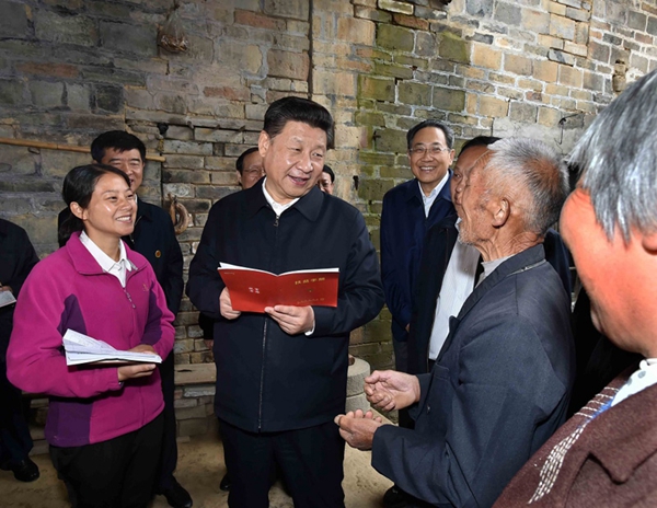 4月24日下午,習近平在六安市金寨縣花石鄉(xiāng)大灣村村民汪能保家中察看扶貧手冊。新華社記者 李濤 攝