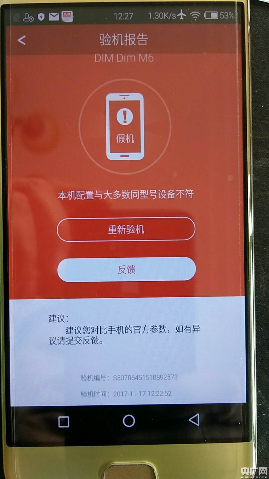 17日,李先生向央廣網(wǎng)記者展示了通過評測軟件測試這款手機的驗機報告截圖,圖片中清晰寫有“檢驗報告:假機,本機配置與大多數(shù)同型號設(shè)備不符!