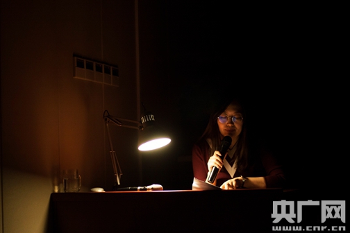 講述員烏日娜正在口述電影(張佳琪 攝)