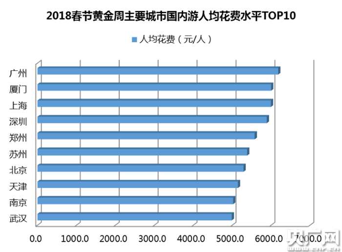 記者根據(jù)上述數(shù)據(jù)報告還發(fā)現(xiàn),在旅游消費水平上,全國游客用于購買旅游產(chǎn)品(交通、住宿、線路等)的人均支出接近4000元/人,相比往年進(jìn)一步提高。其中,春節(jié)黃金周出游人均花費水平最高的前十個城市依次為:廣州、廈門、上海、深圳、鄭州、蘇州、北京、天津、南京、武漢,人均花費基本都在5000元/人以上。