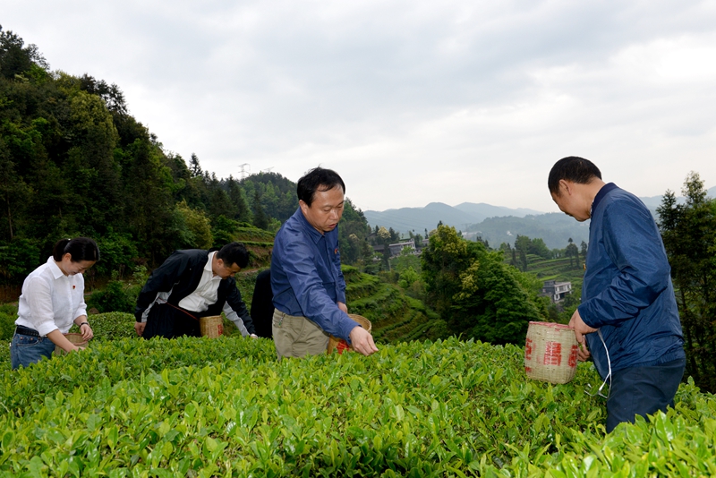 劉芳震在茶園中與村民采摘春茶