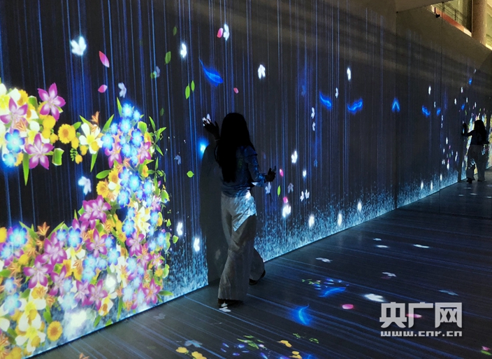 在沉浸式VR體驗(yàn)區(qū),工作人員觸摸屏幕,指尖便開出姹紫嫣紅的花朵。