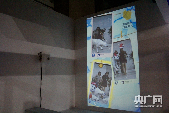 AR互動拍照區(qū)里,游客揮動雙手,憨態(tài)可掬的北極熊便出現(xiàn)在屏幕中,與人們拍照互動。戴上可愛的圣誕帽,與北極熊親密擁抱,還有一條酷似史努比的小狗在一旁撒歡兒,點(diǎn)一下拍照按鈕,這一畫面便定格下來。