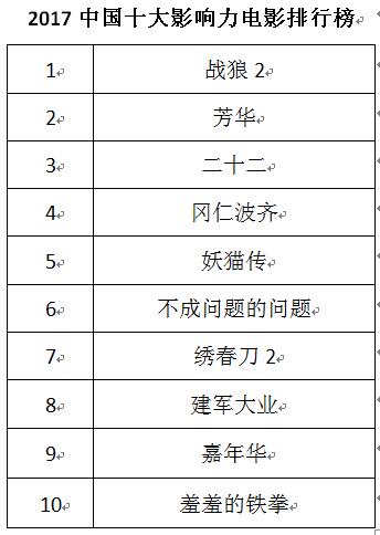 通過(guò)評(píng)審團(tuán)投票,2017年度中國(guó)電影、電視劇影響力排行榜如下: