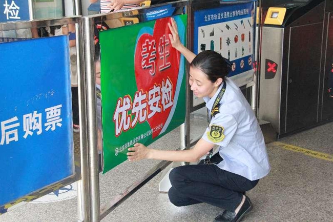 據(jù)北京地鐵相關(guān)負(fù)責(zé)人介紹,大部分車站均開辟考生“三優(yōu)先”通道,為考生保駕護(hù)航。安檢區(qū)域?qū)嵭小翱忌鷥?yōu)先安檢”的措施,實(shí)行“考生優(yōu)先進(jìn)站”的措施,憑本人準(zhǔn)考證從指定通道優(yōu)先進(jìn)站乘車。