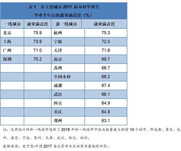 記者還注意到,近五屆大學(xué)畢業(yè)生就業(yè)滿(mǎn)意度持續(xù)上升,共上升11個(gè)百分點(diǎn)。從不同城市來(lái)看,北京是“北上廣深”四個(gè)一線城市中就業(yè)滿(mǎn)意度最高城市,杭州是新一線城市中就業(yè)滿(mǎn)意度最高城市。