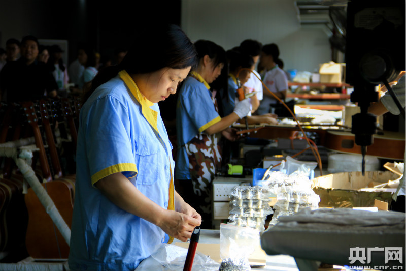 “我們鼓勵當(dāng)?shù)刎毨羟皝砭蜆I(yè),而且會優(yōu)先錄用他們!弊窳x神曲樂器制造有限公司總經(jīng)理鄭傳久表示,公司一直在積極推進(jìn)扶貧工作!柏毨糁灰诠揪蜆I(yè),就會在基本工資之外多加200元每月的補(bǔ)助;如果貧困員工的子女在附近上學(xué),公司還會免費(fèi)為他們提供吃。蝗绻优即髮W(xué),每年會給他們5000塊錢的讀書補(bǔ)助……”在鄭傳久看來,政府給了神曲公司如此好的平臺,自己發(fā)自內(nèi)心想去做更多回饋社會的事。