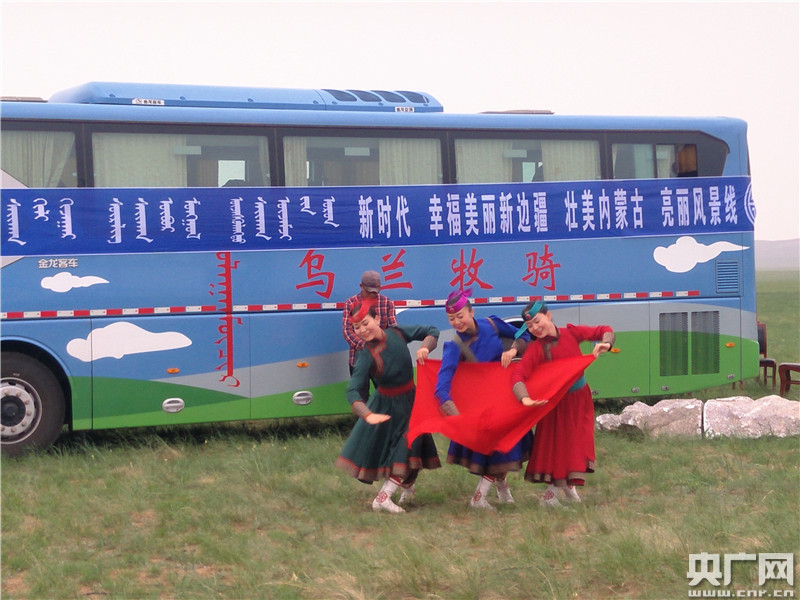 在內(nèi)蒙古自治區(qū)錫林浩特市寶力根蘇木勝利嘎查的草地上,一輛印有“烏蘭牧騎”字樣的藍(lán)色大巴車緩緩?fù)O,身著蒙古族服飾的老中青?duì)員們接連下車,忙著擺置板凳桌椅、換裝上妝、現(xiàn)場試音......草地即是舞臺(tái),藍(lán)天就是幕布,一場演出馬上開始。