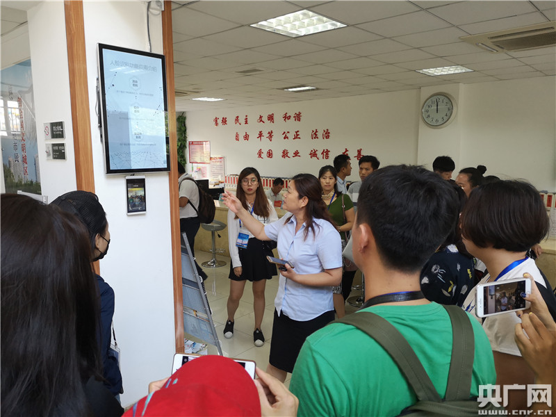 華納社區(qū)黨委書記劉紅霞向記者介紹人臉識(shí)別系統(tǒng),居民可通過“刷臉”參加社區(qū)活動(dòng)簽到、預(yù)約社區(qū)活動(dòng)場(chǎng)地,實(shí)現(xiàn)免證件辦理等業(yè)務(wù)。(央廣網(wǎng)記者 梁爽 攝)