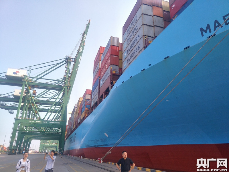 一輛輛集裝箱卡車魚貫穿梭在碼頭與堆場(chǎng)之間,將大批進(jìn)出口貨物送到整裝待發(fā)的國際集裝箱巨輪前。(央廣網(wǎng)記者 王晶 攝)