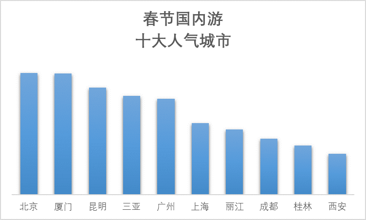 哪些國(guó)內(nèi)旅游城市是今年春節(jié)的贏家?根據(jù)攜程跟團(tuán)游和自由行數(shù)據(jù),最受游客歡迎的國(guó)內(nèi)旅游城市前十分別是北京、廈門、昆明、三亞、廣州、上海、麗江、成都、桂林和西安。