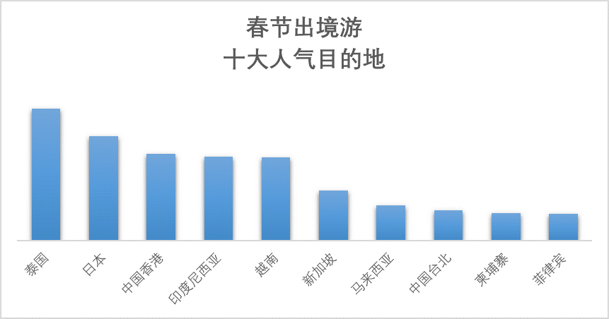 春節(jié)出境游去哪兒玩?根據(jù)攜程跟團(tuán)游和自由行訂單數(shù)據(jù),人氣最高的前十大目的地依次是泰國(guó)、日本、中國(guó)香港、印度尼西亞、越南、新加坡、馬來(lái)西亞、中國(guó)臺(tái)北、柬埔寨和菲律賓,東南亞和日本仍是中國(guó)人出境游的首選。