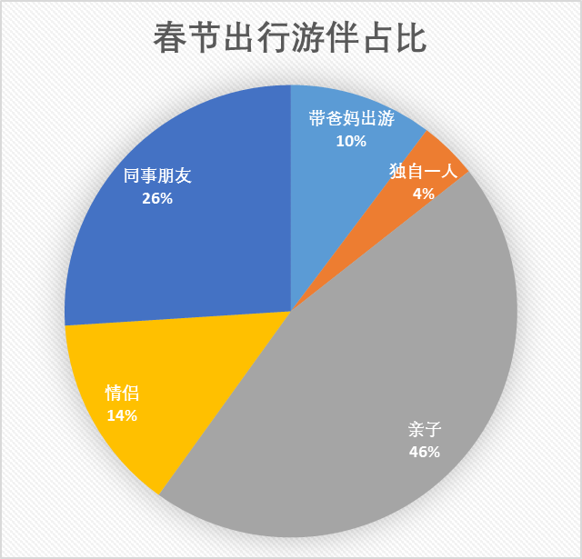 和誰(shuí)一起春節(jié)出游?根據(jù)攜程跟團(tuán)游和自由行訂單數(shù)據(jù),親子游是春節(jié)假期出游的主流,占比達(dá)46%,利用難得的假期和孩子共度是多少父母的選擇。而選擇和朋友出游的占比也不少,達(dá)到了26%。
