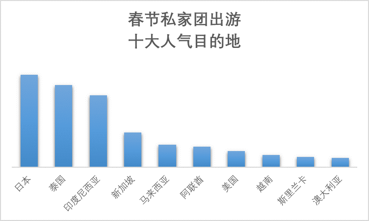 根據(jù)攜程私家團(tuán)訂單數(shù)據(jù),春節(jié)私家團(tuán)出游十大人氣目的地依次為日本、泰國(guó)、印度尼西亞、新加坡、馬來(lái)西亞、阿聯(lián)酋、美國(guó)、越南、斯里蘭卡和澳大利亞。