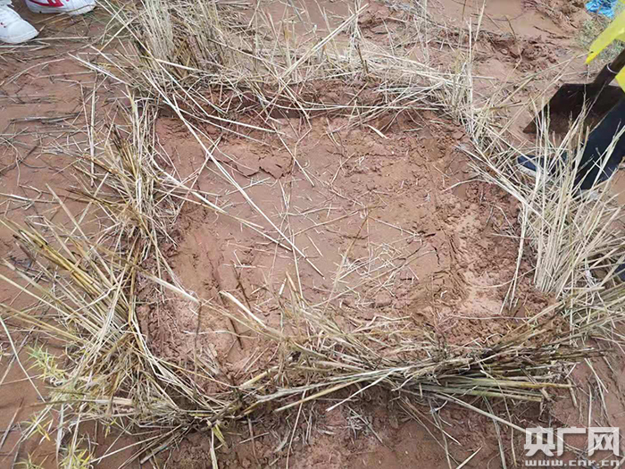 唐希明現(xiàn)場(chǎng)扎制的麥草方格。(央廣網(wǎng)記者 熊瑋 攝)