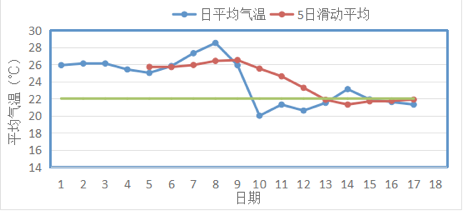 由上圖可見,2019年自9月13日起滑動平均氣溫序列開始小于22℃,并于9月17日達到連續(xù)5天小于22℃,其所對應的氣溫序列中第一個小于22℃的日期為9月10日(20.0℃),而常年入秋日期為9月9日,因此無需進行二次判斷,據此可判斷2019年入秋日期為9月10日。