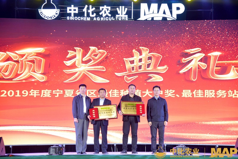 “推動(dòng)鄉(xiāng)村振興 共建鄉(xiāng)風(fēng)文明——中化農(nóng)業(yè)MAP走進(jìn)賀蘭”,趙建文(左二)捧回了“MAP最佳服務(wù)站站長(zhǎng)獎(jiǎng)”。(主辦方供圖)