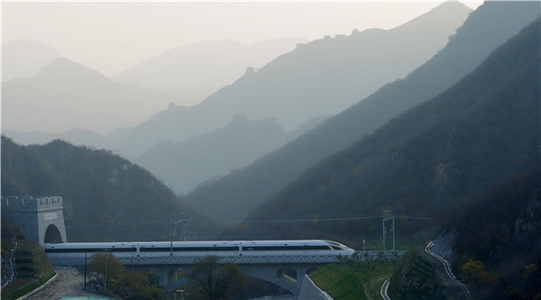 復(fù)興號(hào)飛馳在長(zhǎng)城腳下 攝影:原瑞倫(國(guó)家鐵路集團(tuán)公司供圖)