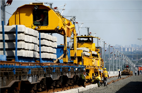 《軌枕鋪裝機(jī)在南口大橋作業(yè)》 攝影:朱河(北京局集團(tuán)公司供圖)