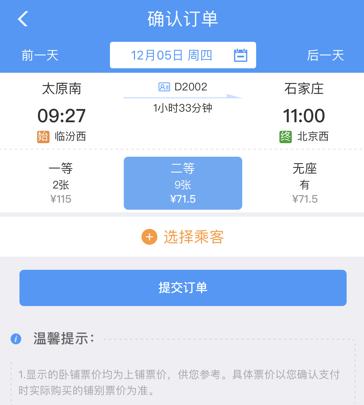 太原南至石家莊的票價(jià)(來(lái)源:12306網(wǎng)站截圖)
