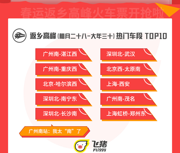 值得注意的是,廣州南站春運(yùn)高峰客流量最高,成為最繁忙的火車站,占據(jù)了TOP10中的三個(gè)車段:廣州南-湛江西,廣州南-重慶西,廣州南-茂名。另外,根據(jù)飛豬平臺(tái)火車票預(yù)約情況,春運(yùn)回程高峰將出現(xiàn)在大年初五至初八,選擇初六返程的人最多。春運(yùn)回程高峰期間,熱門車段TOP10的到達(dá)站同樣被北、上、廣、深四城“包場(chǎng)”,其中廣州南站獨(dú)占4席。