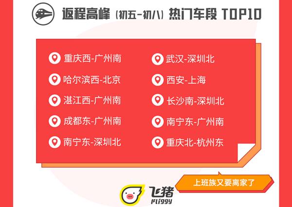返程高峰(大年初五-初八)熱門車段TOP10
