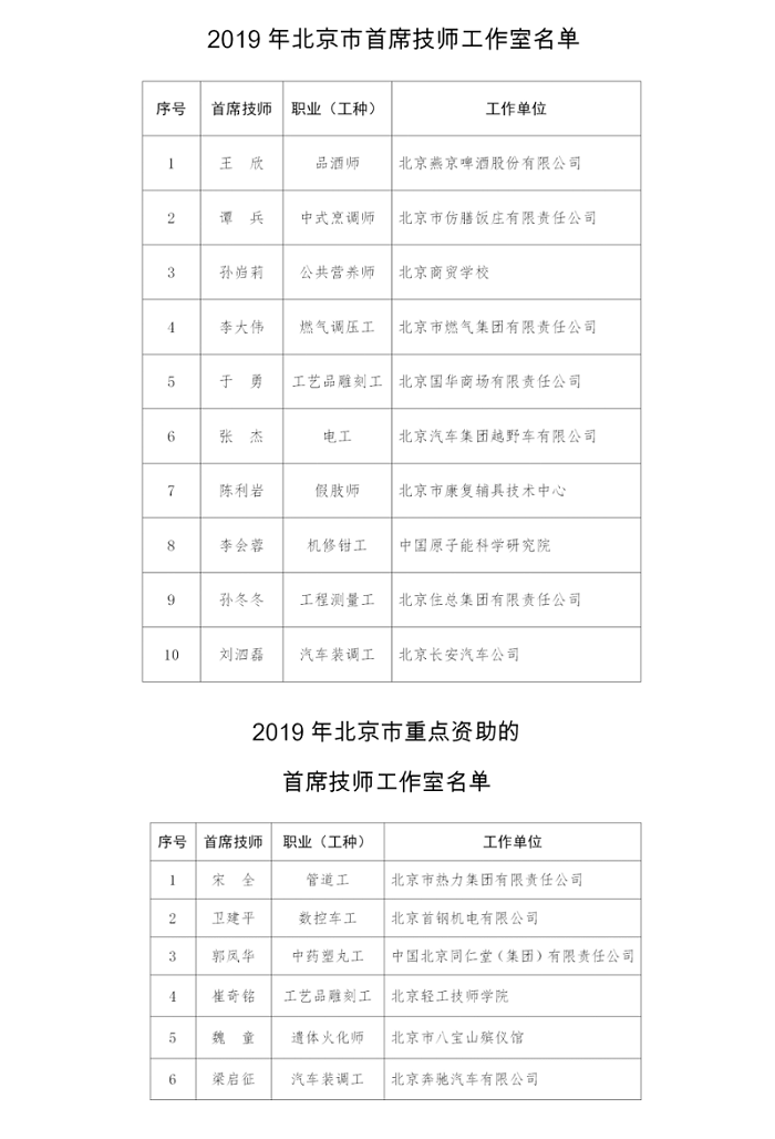 北京市人社局公布“2019年北京市首席技師工作室名單”和“2019年北京市重點資助的首席技師工作室名單工作室名單”(央廣網(wǎng)發(fā) 北京市人社局制圖)