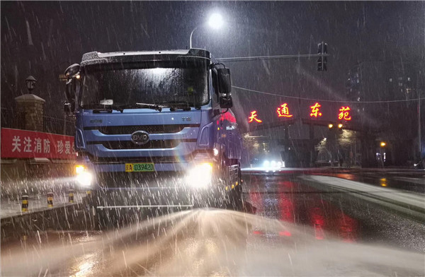 1月5日晚,北京環(huán)衛(wèi)集團多功能除雪車正在作業(yè)中(北京環(huán)衛(wèi)集團供圖)