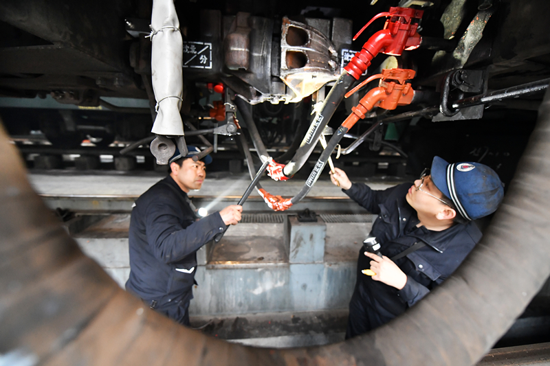 從2019年12月起對全部支南列車進(jìn)行細(xì)致整備。在車輛整修中首次在對全列車輪輞打磨除銹后,使用便攜式探傷儀探傷檢查并對制動管活接進(jìn)行全部緊固處理,使用“超聲波側(cè)漏儀”配合“測漏液”對客車制動管系活接進(jìn)行全面查漏,消除漏泄部位(央廣網(wǎng)發(fā) 沈陽鐵路供圖)