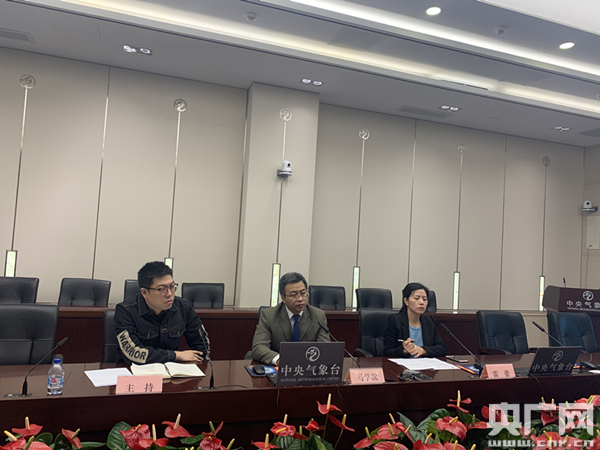 中央氣象臺(tái)首席預(yù)報(bào)員馬學(xué)款(中)向記者分析最新天氣形勢(shì)(央廣網(wǎng)記者 孫冰潔 攝)