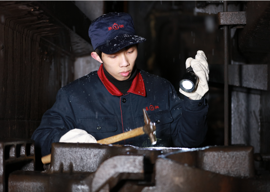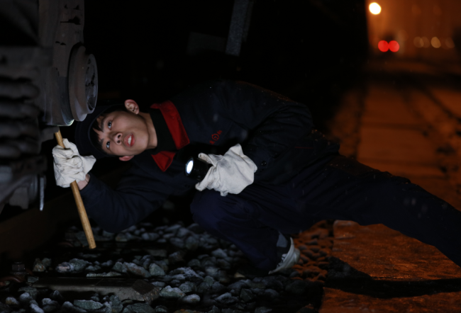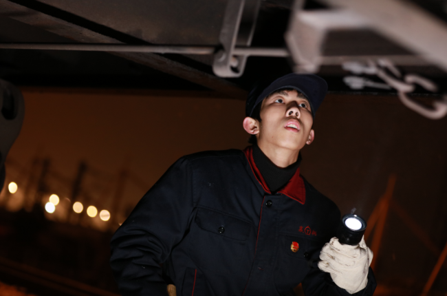 檢車(chē)員也被稱為給貨物列車(chē)“瞧病”的“車(chē)輛大夫”,常年露天作業(yè),夏日里蚊叮蟲(chóng)咬,冬日里與冰雪相伴,白班、夜班倒班,夜班從18點(diǎn)接班到第二天8點(diǎn)交班,一個(gè)晚上一般要技檢15趟以上列車(chē),到達(dá)列車(chē)要檢查35分鐘,始發(fā)列車(chē)要技檢25分鐘。00后的邢毅,迎來(lái)了他第一個(gè)春運(yùn)中的第一場(chǎng)雪,也像一個(gè)初次登上“星光大道”的歌手,在燈火、轟鳴、飛雪中迎接著一場(chǎng)沒(méi)有裁判的大考。他認(rèn)真地給列車(chē)“體檢”,排除車(chē)輛故障,消除車(chē)輛隱患。始發(fā)列車(chē)進(jìn)行制動(dòng)機(jī)的試驗(yàn),跑動(dòng)查看每輛貨車(chē)制動(dòng)機(jī)是否正常出閘、是否正常緩解,來(lái)回兩趟跑動(dòng)1公里多。