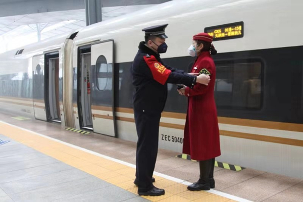 隨著武漢疫情的不斷加劇,張棕鵬將更多的精力放到所轄2對途徑武漢的高鐵列車上。1月30日一大早,張棕鵬來到天津西站,專門到站臺送G305/6次列車。G305/6次列車是新開行線路,乘警也是剛?cè)刖哪贻p同志。他擔(dān)心青年民警心理壓力大,專門學(xué)習(xí)了新型冠狀病毒傳播的知識,給青年民警疏導(dǎo)減壓;他又怕青年民警遇到感染病毒旅客,不注重方式方法蠻干感染上病毒,再三叮囑做好自身防護(hù)。今天碰巧,列車長就是他妻子滿運(yùn)媛。列車臨行了,張棕鵬為她整理了一下列車長袖標(biāo),簡單說了一句“你也要注意自身安全”。邊應(yīng)答著,滿運(yùn)媛邊為丈夫也整理了一下衣領(lǐng)。