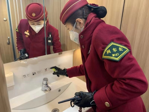 面對如此嚴(yán)峻的疫情,干了12年列車長的滿運(yùn)媛不敢有一絲懈怠,每次巡視車廂,她都仔細(xì)觀察著每一名旅客,生怕遺漏了有感冒、發(fā)燒體征的旅客。她常說:“疫情面前,每一次小心謹(jǐn)慎,都是把安全關(guān)擰的再緊一些”。值乘工作中,她看到旅客摘下口罩就去提示,見到旅客口罩佩戴不規(guī)范的就去幫助改正。一天下來,通常是腰酸了、腳底板腫了、喉嚨啞了,但她從沒有為此降低工作標(biāo)準(zhǔn)。她認(rèn)為特殊時期就必須多付出一些,只有自己的工作干到位了,旅客的安全才能有保證。