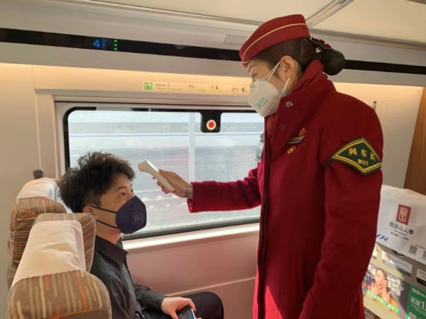 滿運(yùn)媛在車廂內(nèi)為旅客測量體溫(央廣網(wǎng)發(fā) 北京鐵路公安局供圖)