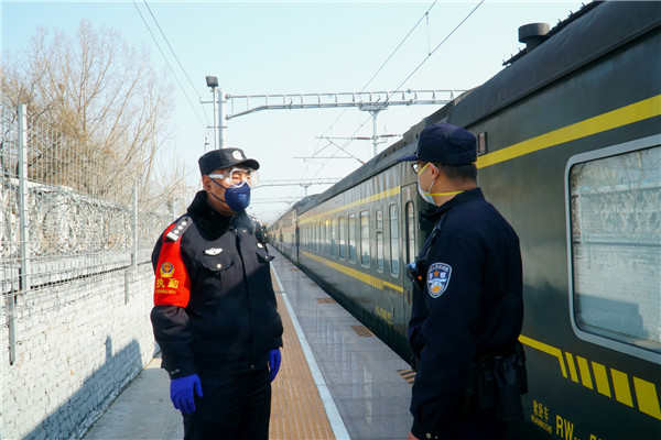 周杰和同事在停車(chē)站臺(tái)執(zhí)勤(央廣網(wǎng)發(fā) 北京鐵路公安處供圖)