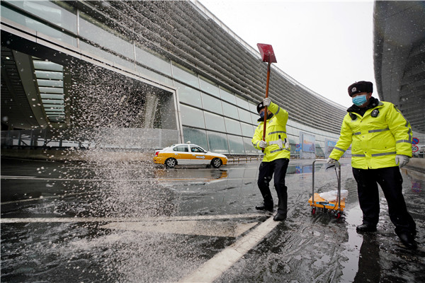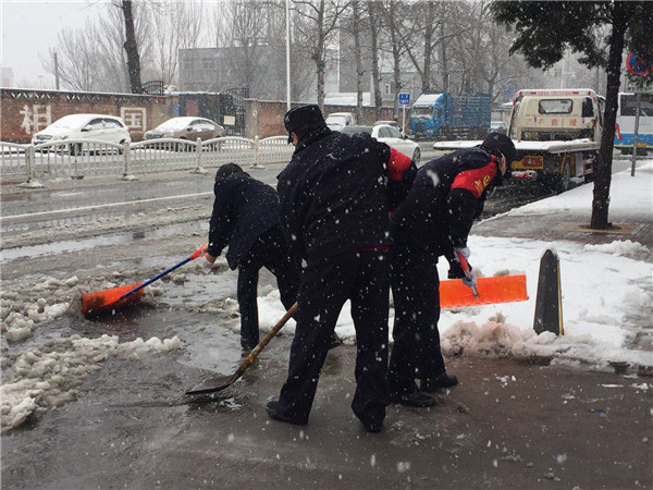 北京南站交警隊安排專人值守站區(qū)高架橋梁、急彎等危險路段,及時對結(jié)冰路段拋灑融雪鹽,對路面積雪進行不間斷清除,確保進站道路正常通行。