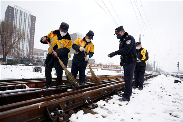鐵警及時清掃鐵軌上的積雪(北京鐵路公安處供圖)