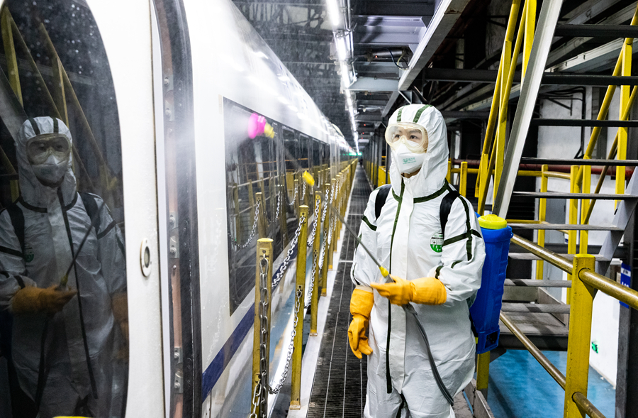 2月24日,中國(guó)鐵路成都局有限公司重慶疾控所工作人員正在為動(dòng)車組車門消毒(央廣網(wǎng)發(fā) 段沖 攝)
