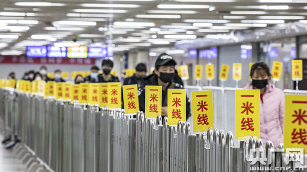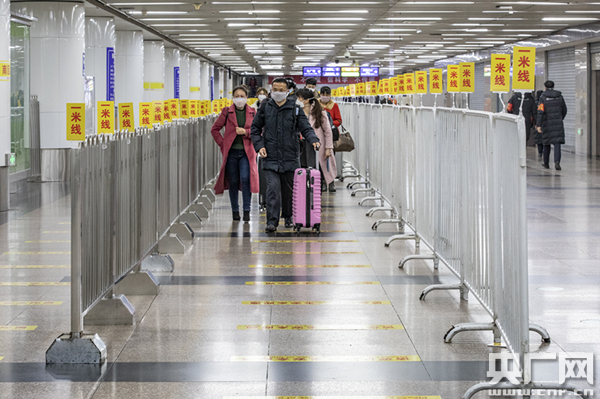 正在出站的旅客彼此間保持距離(央廣網(wǎng)記者 張佳琪 攝)