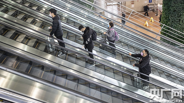 乘坐電梯的旅客之間保持距離(央廣網(wǎng)記者 張佳琪 攝)
