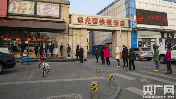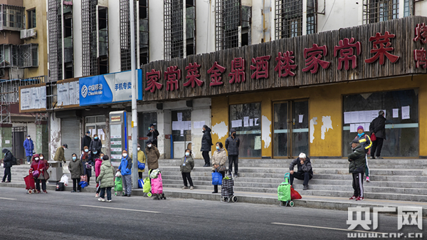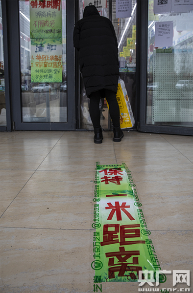 居民們按照“一米線”倡議排隊(duì)購(gòu)物(央廣網(wǎng)記者 張佳琪 攝)