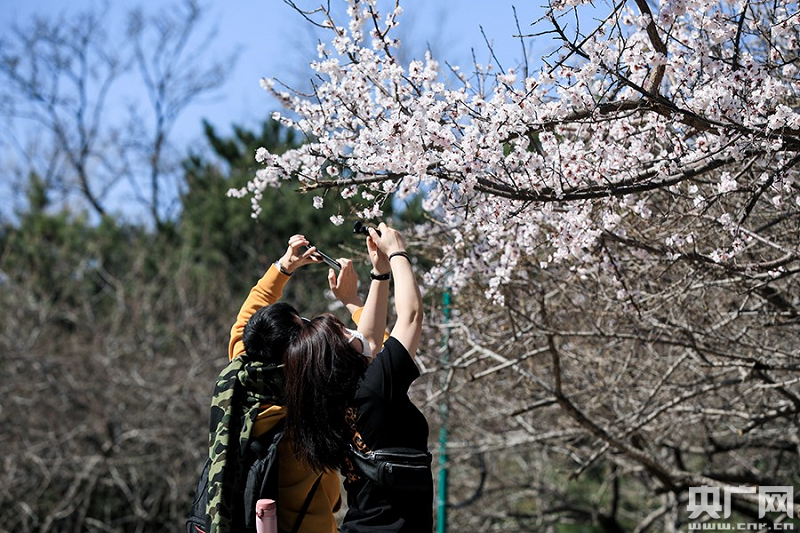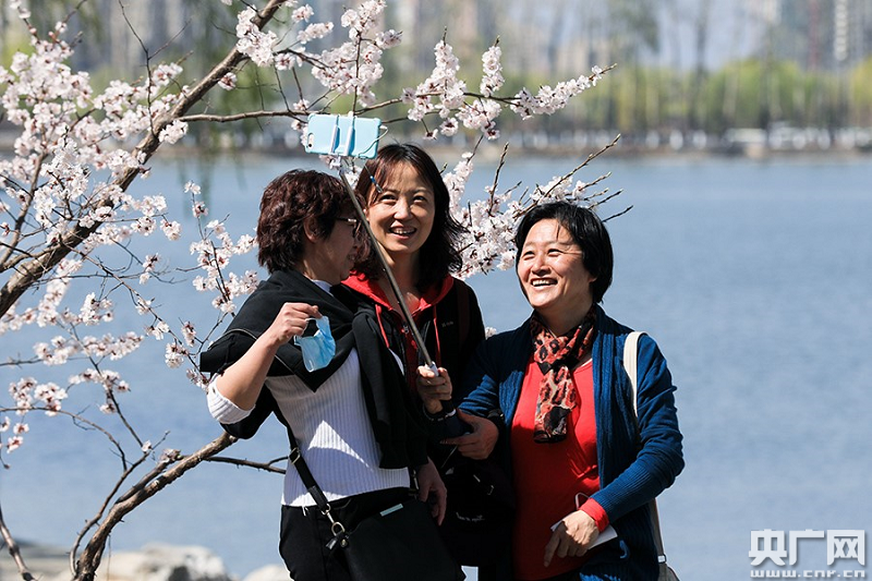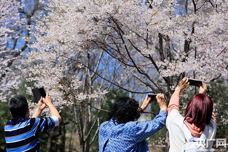 3月23日,在北京玉淵潭公園,游客在確保自身防護(hù)安全的條件下,拍攝盛開(kāi)的櫻花(央廣網(wǎng)記者 石昊鑫 攝)