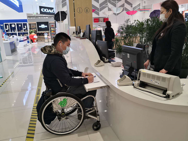 殘疾人朋友體驗(yàn)北京長安商場的低位柜臺(央廣網(wǎng)發(fā) 北京市殘聯(lián)供圖)