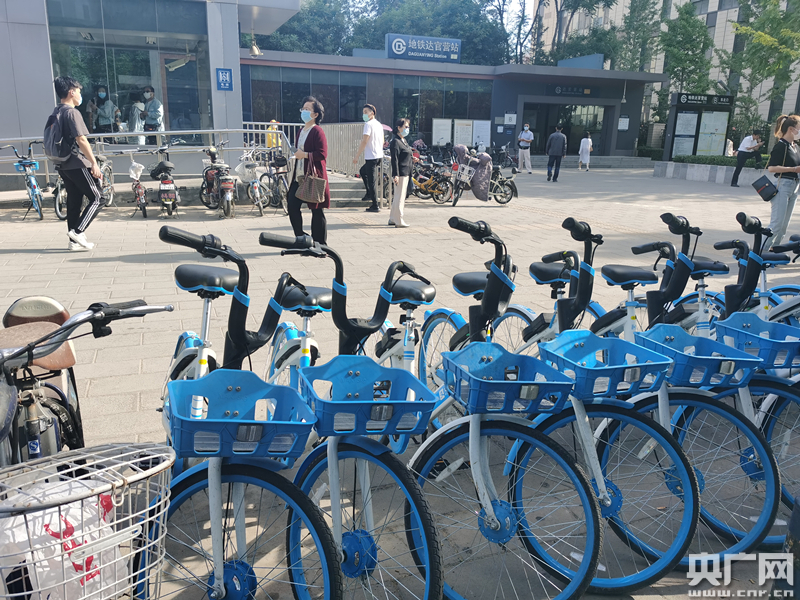 北京地鐵7號(hào)線達(dá)官營(yíng)站前擺放整齊的共享單車(chē)(央廣網(wǎng)記者 劉一荻 攝)